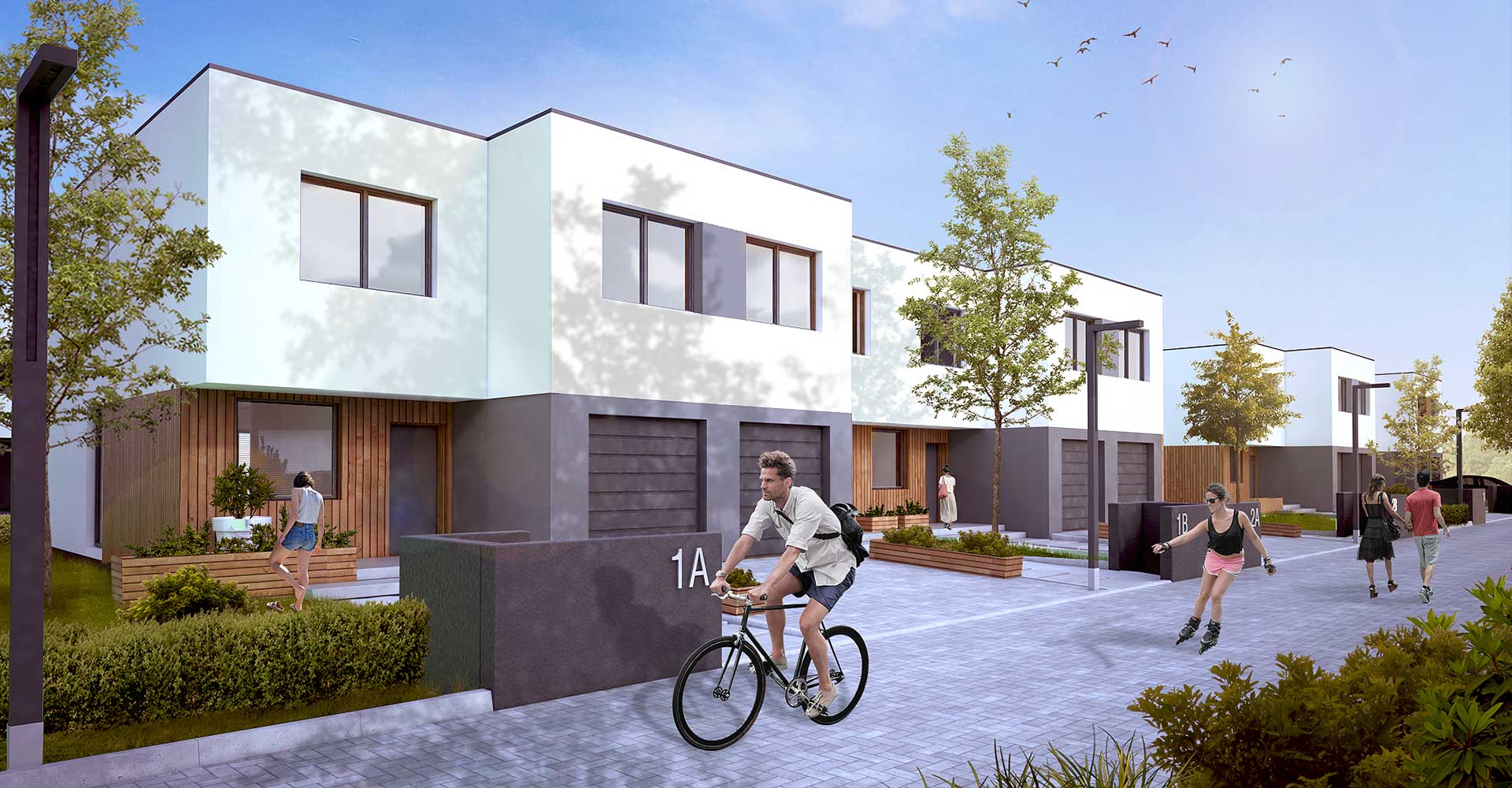 Zbudowane zostaną tylko 4 domy w zabudowie bliźniaczej w nowoczesnej bryle z płaskim dachem. Każdy z ogródkiem, tarasem, 2 miejscami parkingowymi oraz wspólnym terenem rekreacyjnym o powierzchni blisko 400 m2.